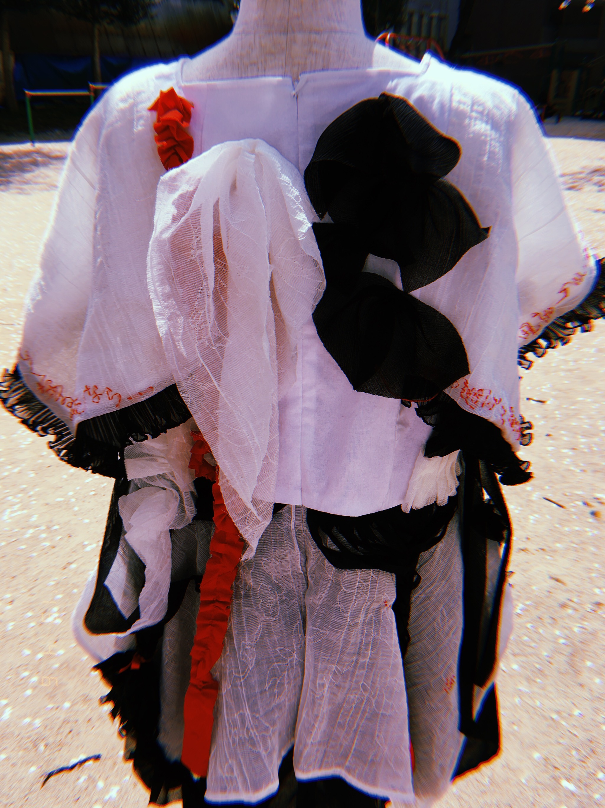 「どこかにいる、ある一人の女の子」をイメージし、黒い布を割いて紐状にしたものを三つ編みにしたり、赤いビーズや赤いりぼんを垂らしたり、女の子の頭の中にある言葉を刺繍しました