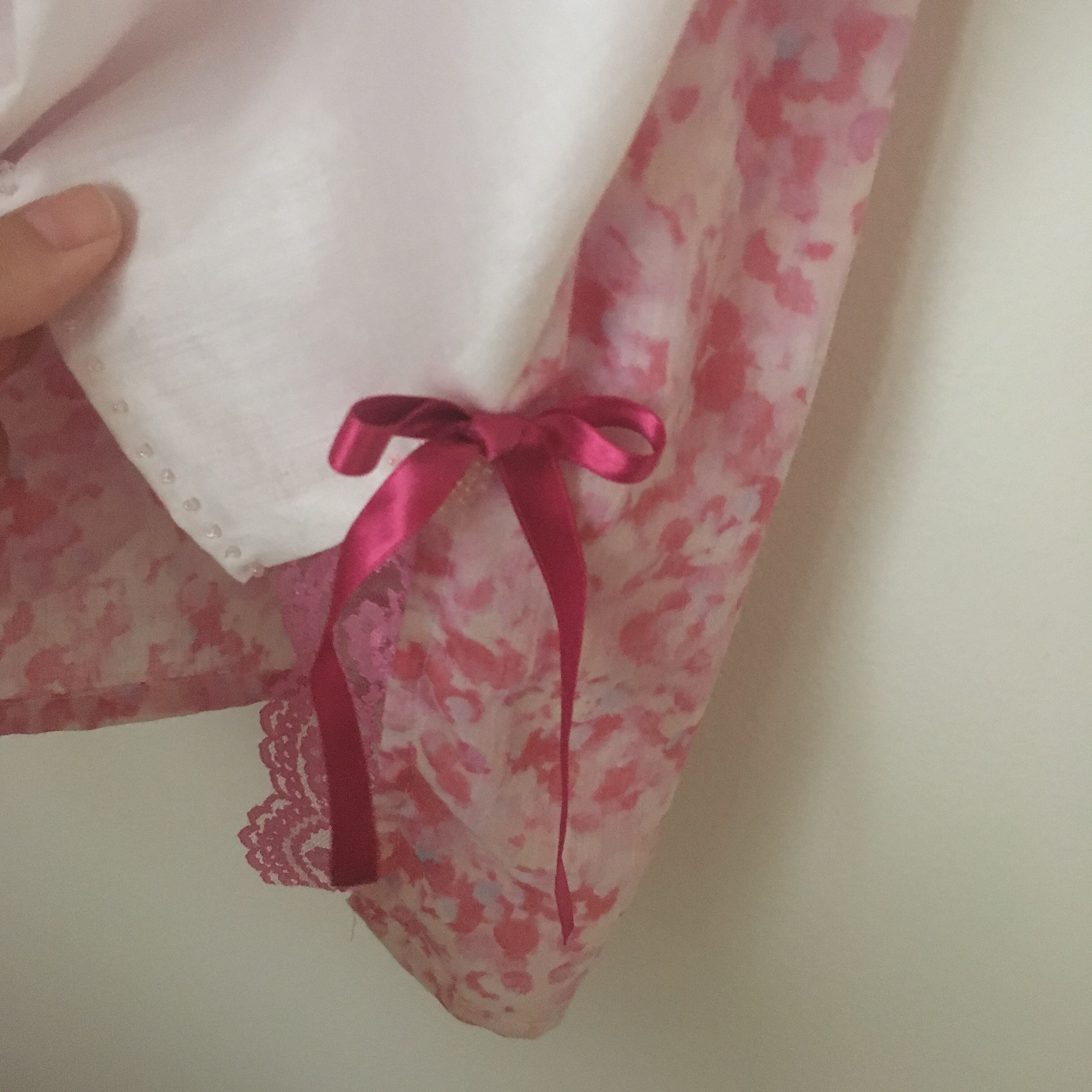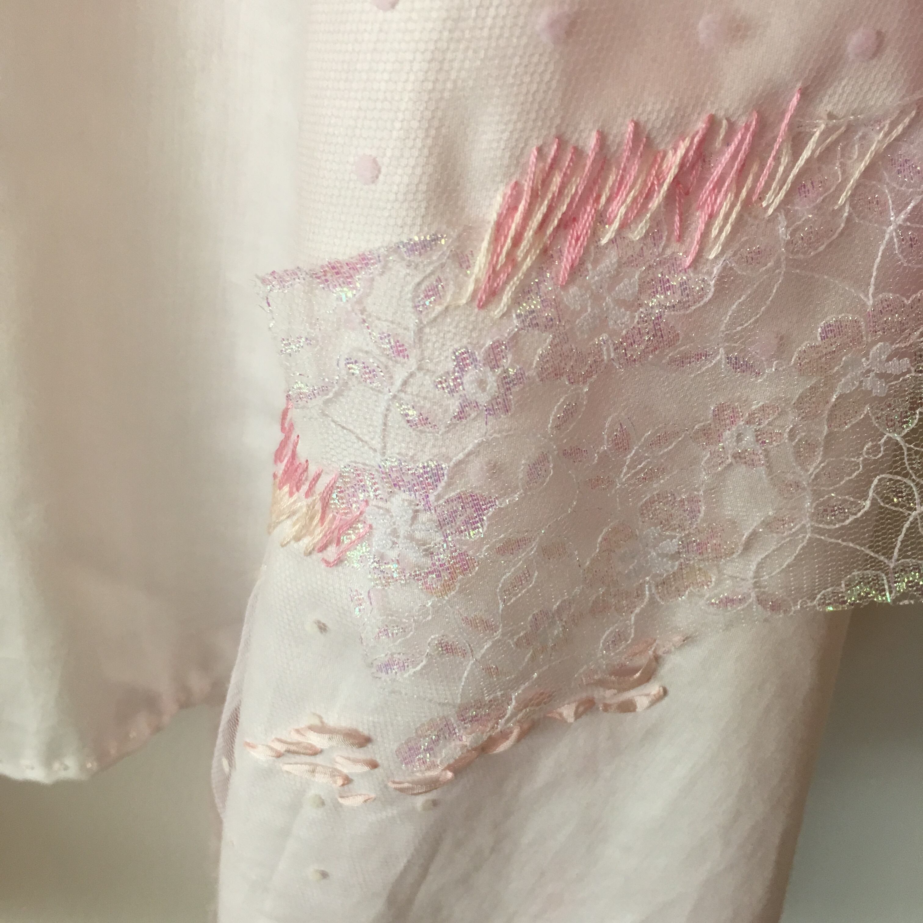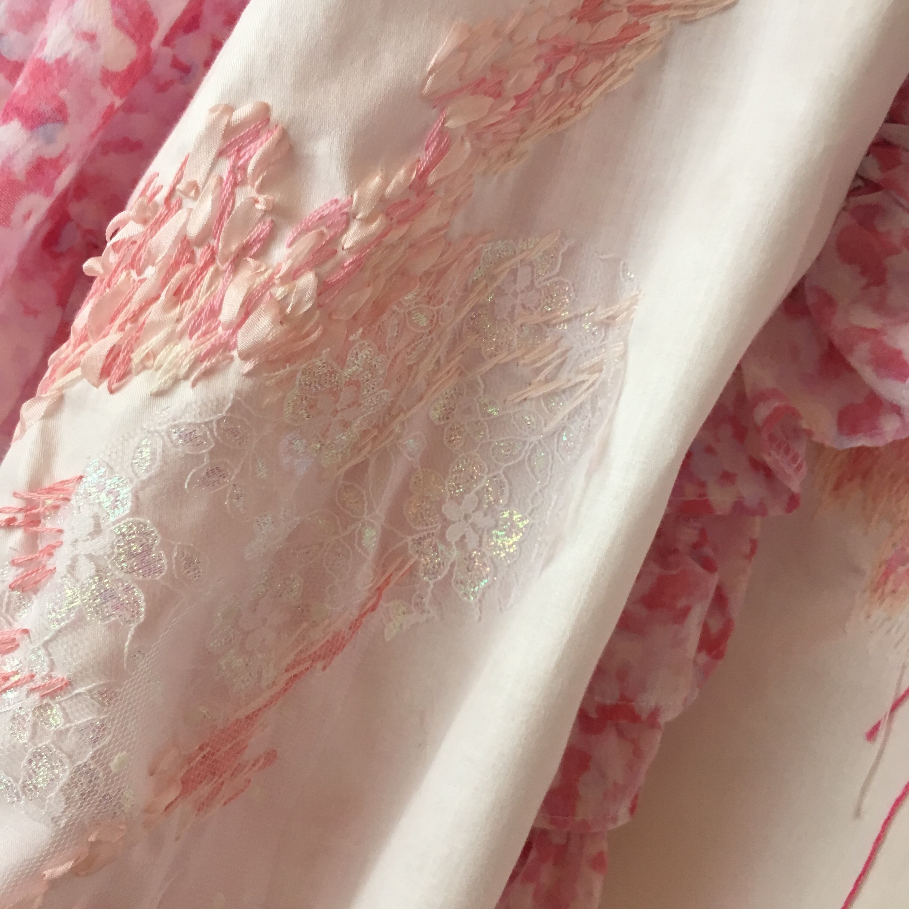 波打つようなフリルや、フリルを止めて縫ったお花、胸元のスパンコールのししゅう
