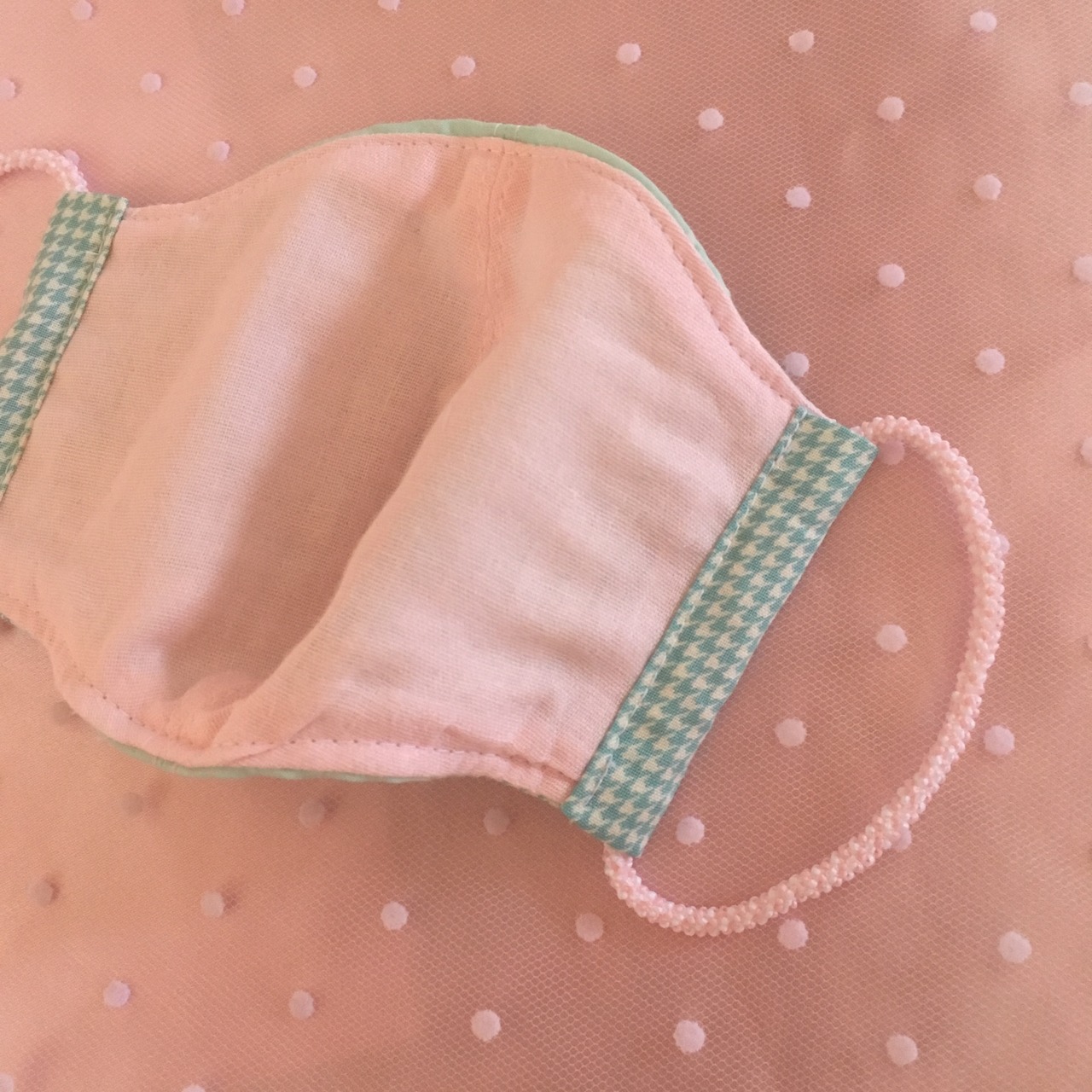 左下のボタンがポイントのパステルグリーンのマスク 正面からはほとんど無地ですが、横からは可愛らしい小さな千鳥格子が見えます