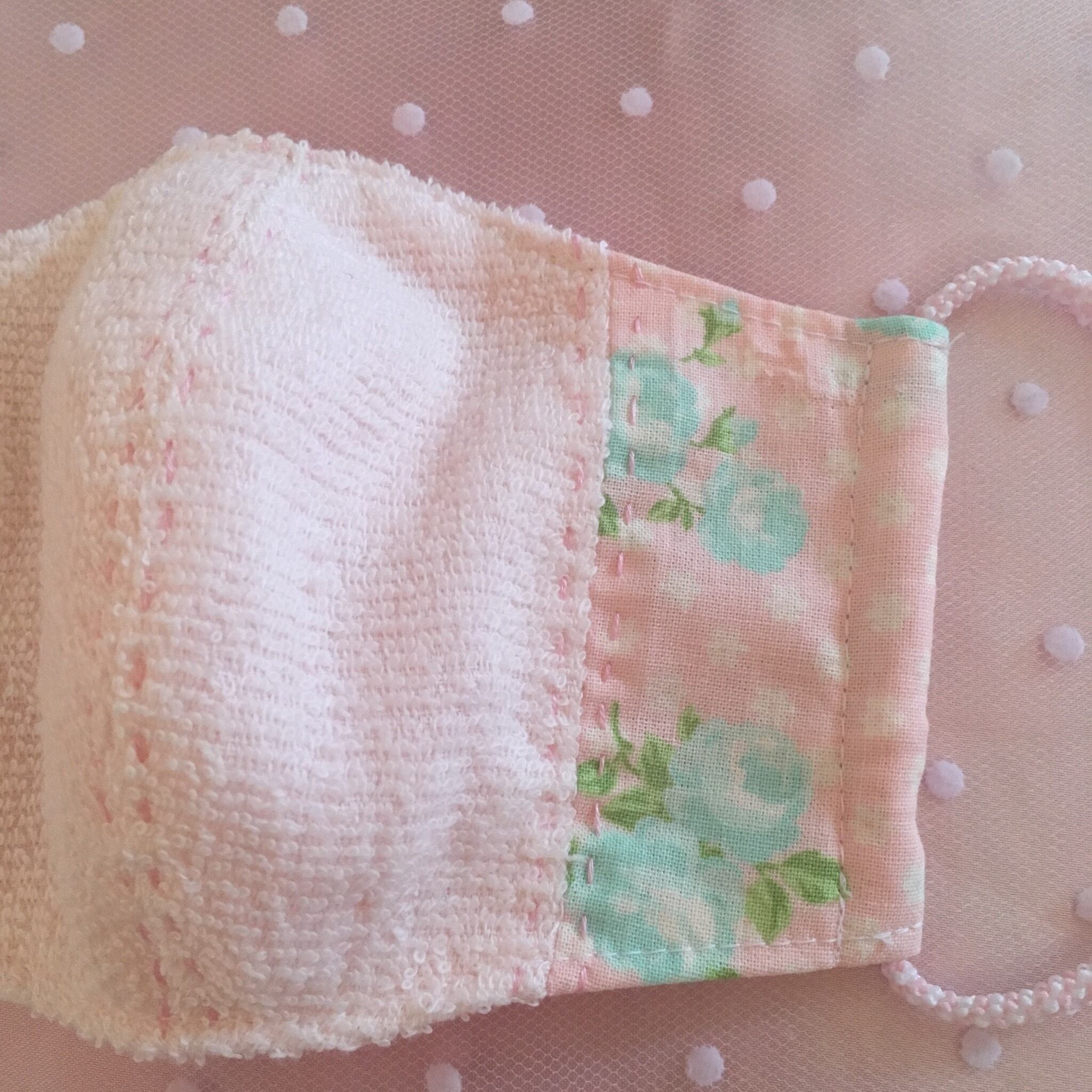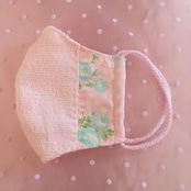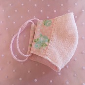 ふわふわの生地にミントグリーンのばらの生地を合わせたマスク 手縫いのステッチがポイントです