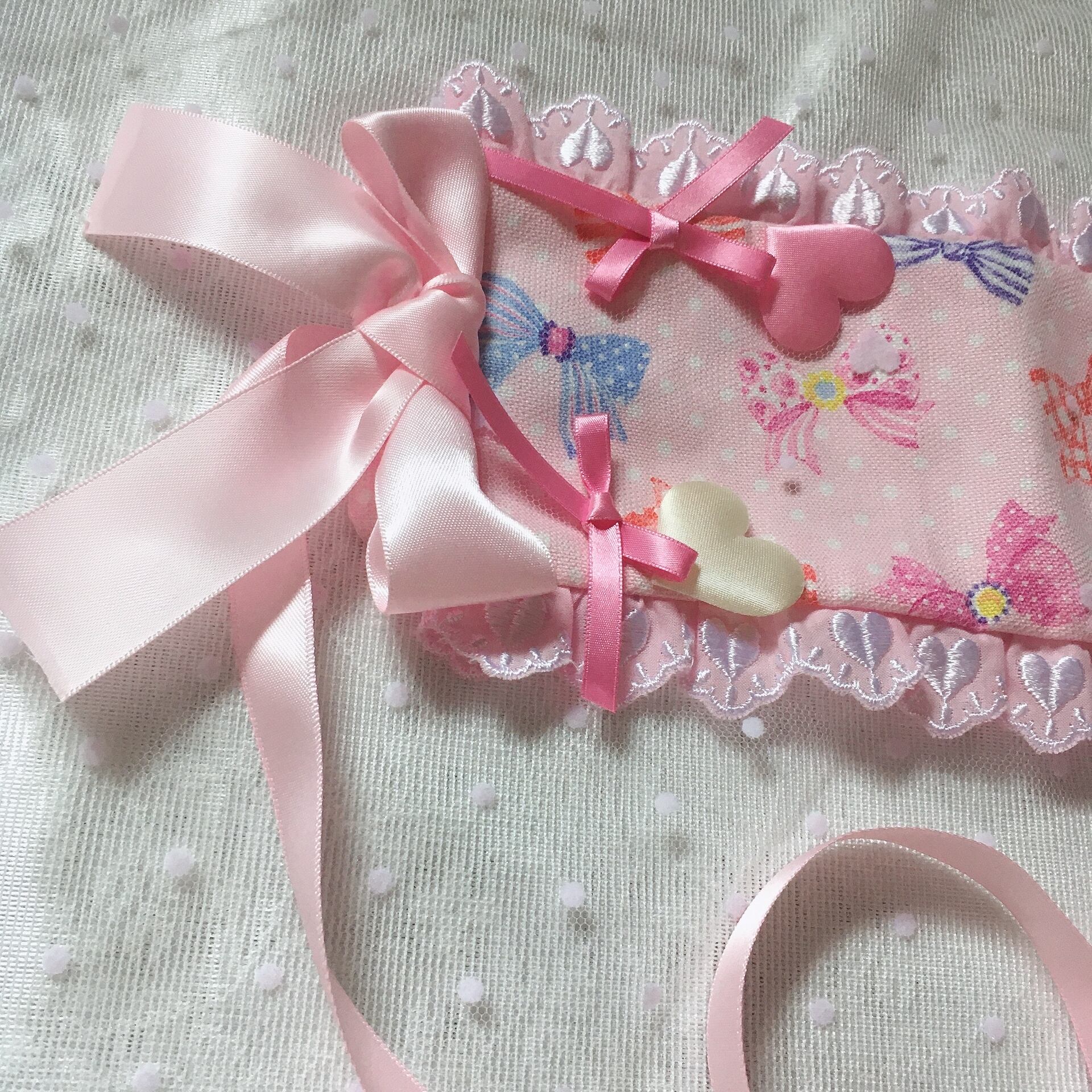 りぼん柄に、りぼん。ハートチュールを重ねてハートのモチーフ。周りにつけたレースもハート柄!のキュートなヘッドドレス