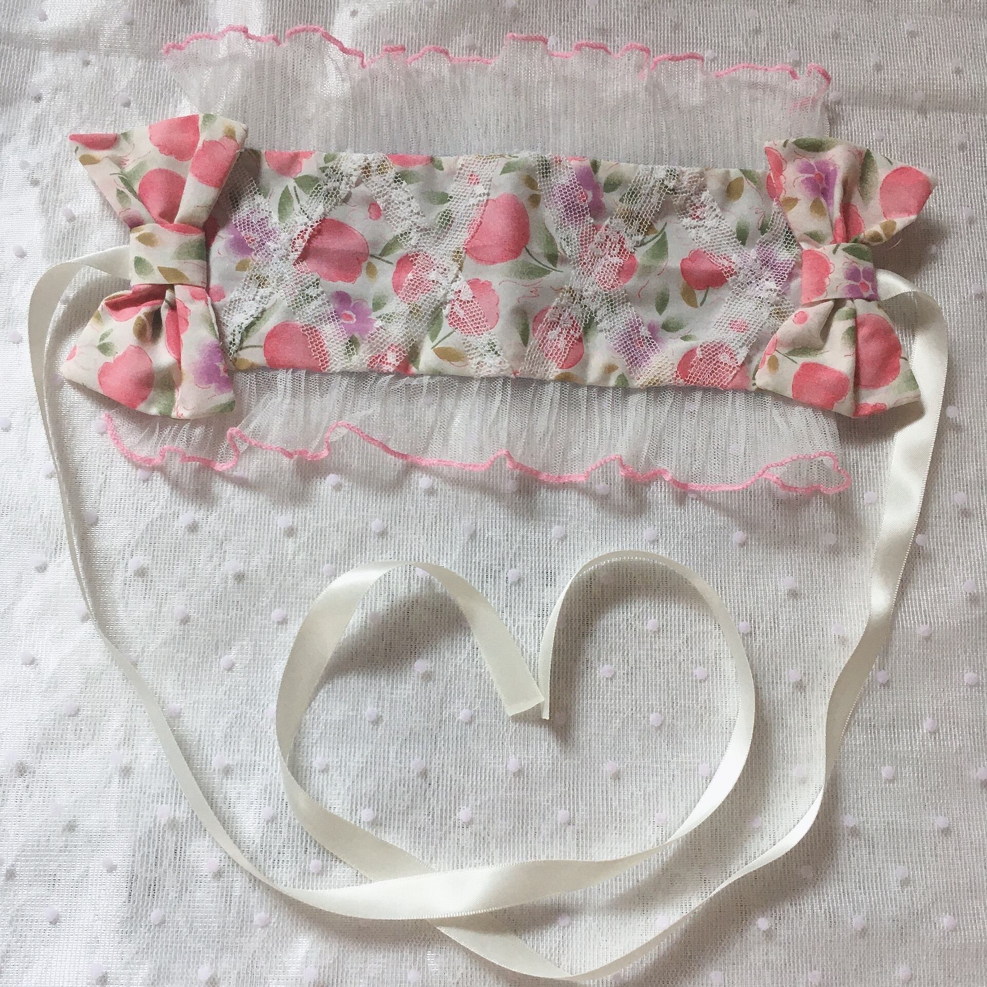 懐かしい雰囲気のチューリップ柄にバイアスに裁断したレース生地を編み上げのように縫い付けました ぷっくりまあるいお花たちがとってもかわいい…端のレースはお花たちの邪魔にならないようチュール素材です 端処理がぴんく色の糸で柄と調和して品のある仕上がりに…