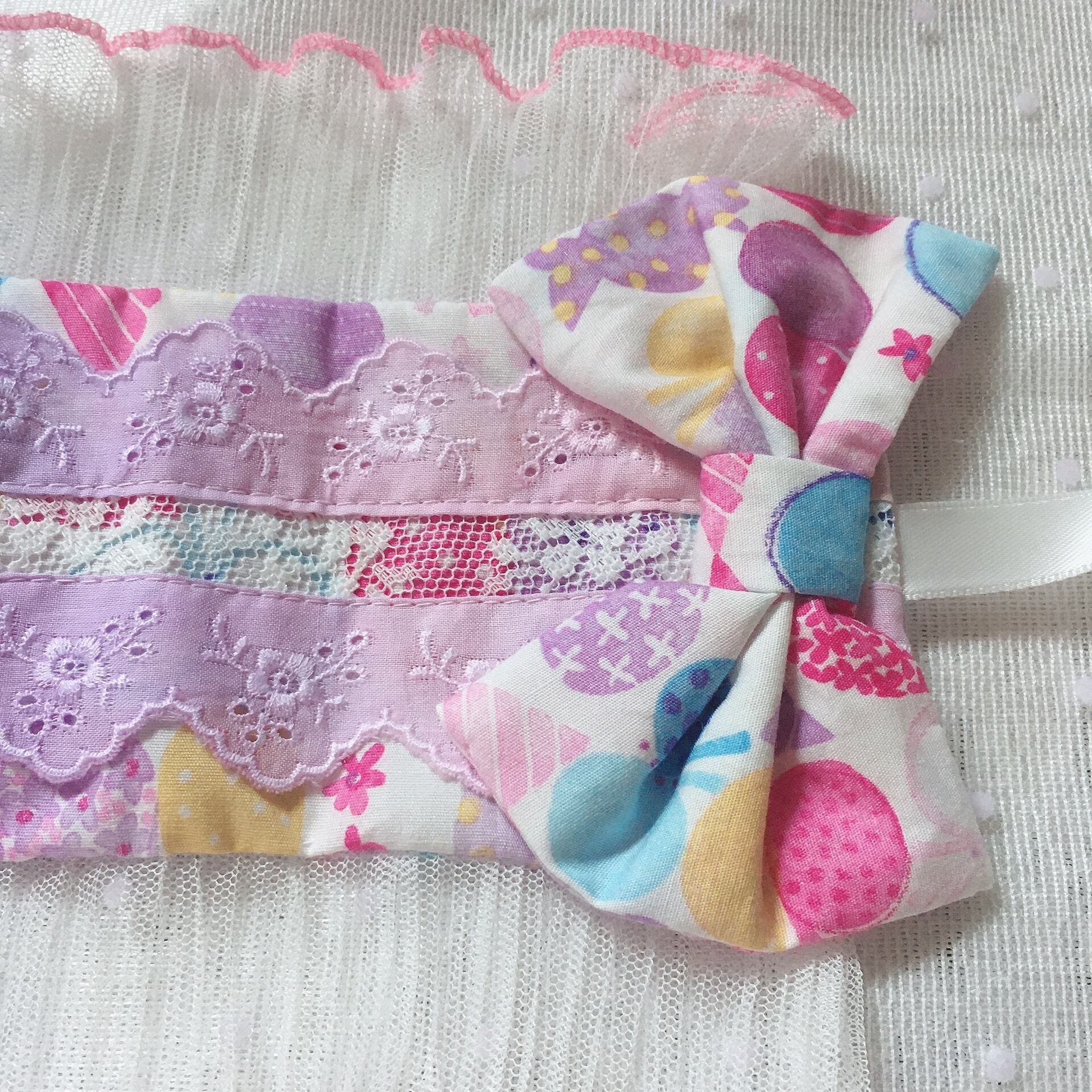 ちょうちょや、紫陽花のようなお花、キャンディのような、風船のような…たくさんのモチーフが楽しい柄の生地に、ロマンチックな色合いグラデーションレースを組み合わせました