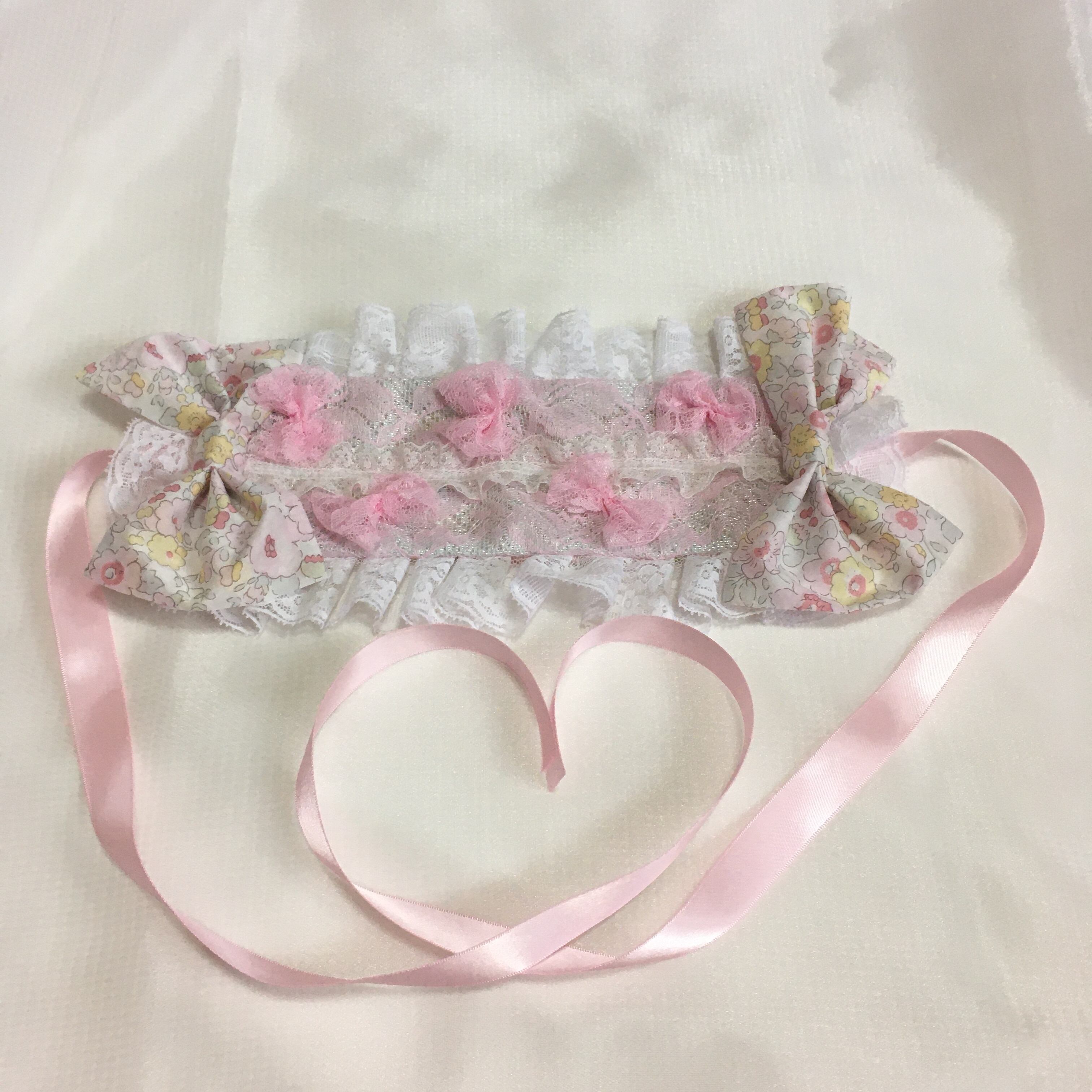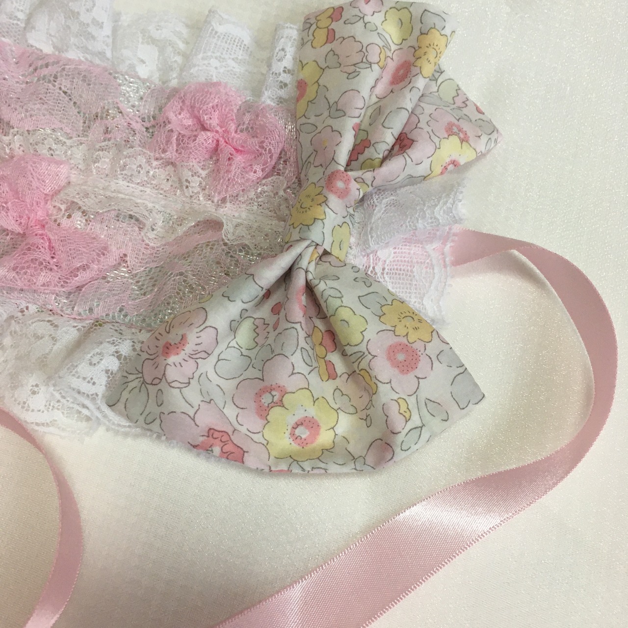 レース生地で作ったりぼんをちょうちょのように縫い止めました