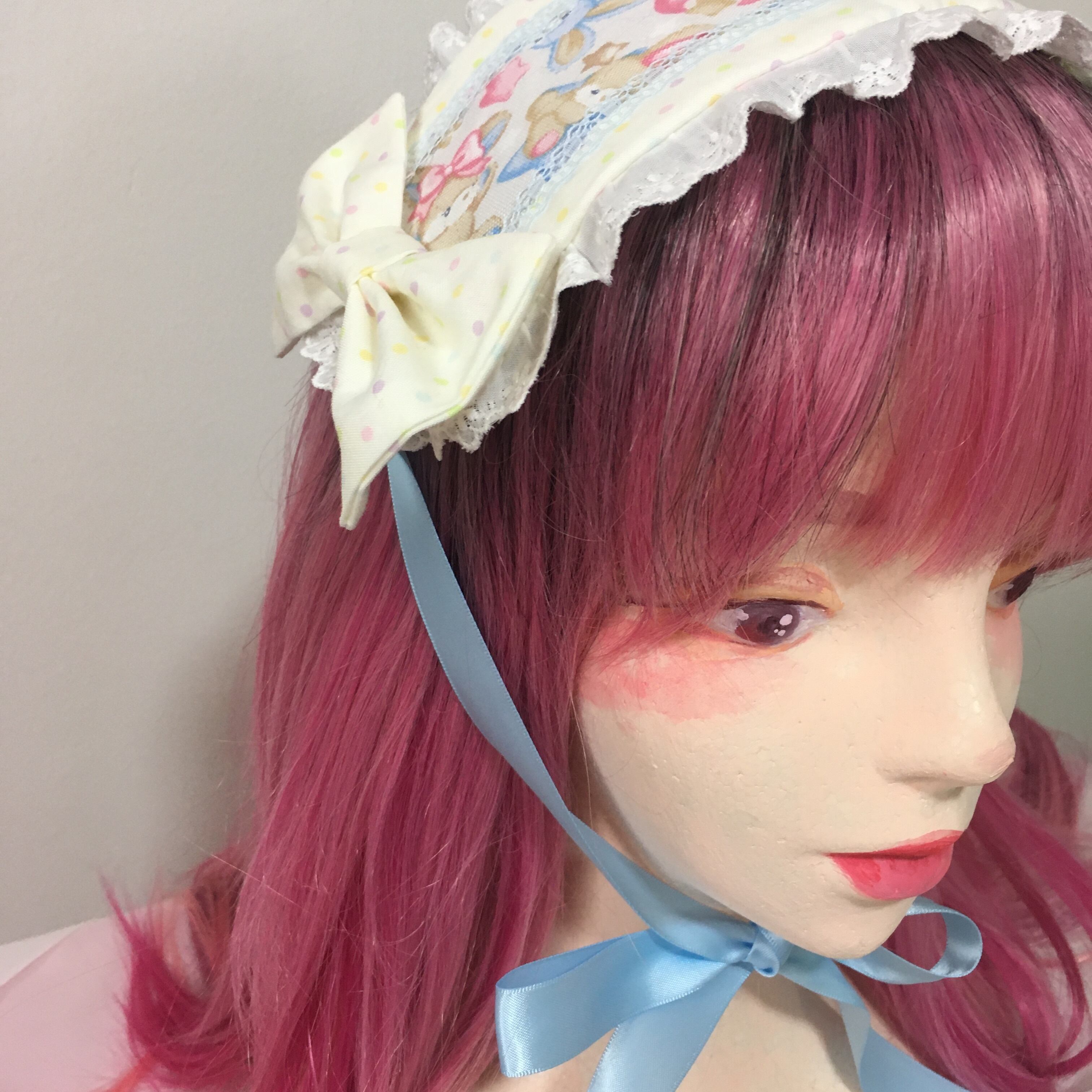 夜になって子供部屋にいたぬいぐるみたちが動き出した…そんな雰囲気の生地と柔らかいクリーム色の星柄の生地をあわせたヘッドドレス